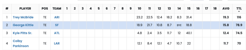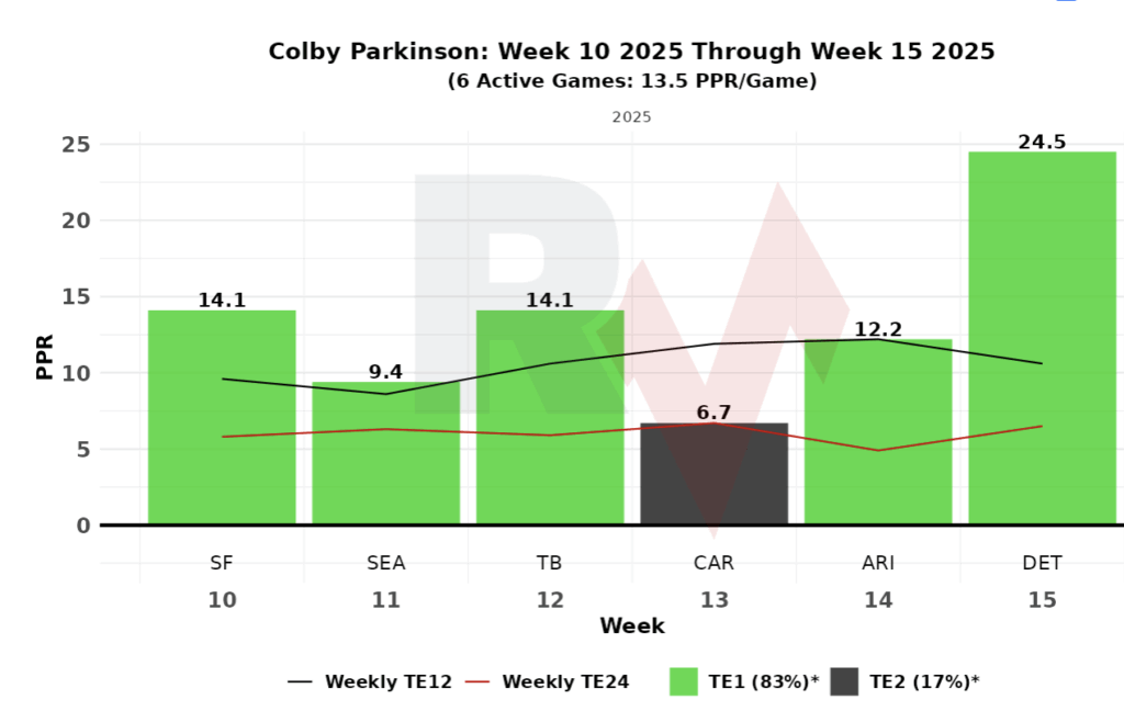 Over this span, Parkinson is the Half-PPR TE4, trailing just Trey McBride, George Kittle, and of course Kyle Pitts after that 40 FP blow-up: