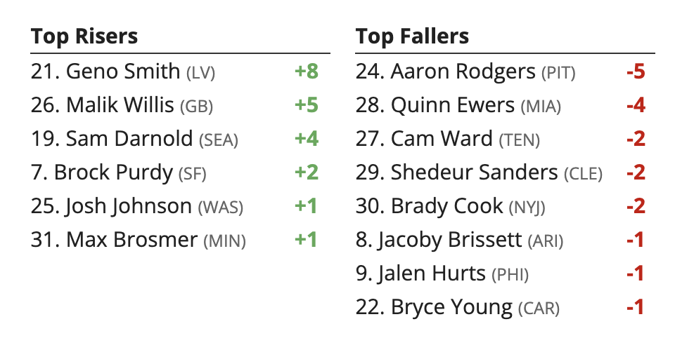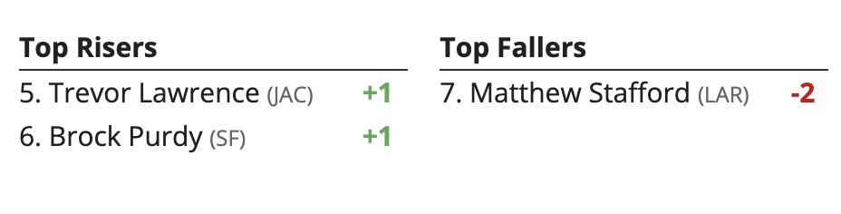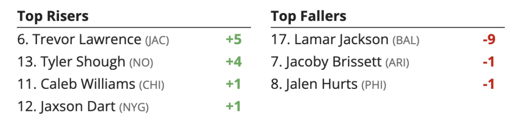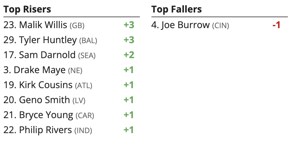 – Philip Rivers looked much better in his second appearance, especially attacking deep with Alec Pierce. Both Pierce and Josh Dowsn received healthy bumps up the rankings.