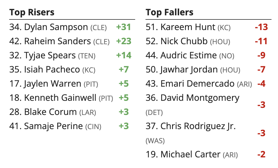 –Dylan Sampson has been added and is a sneaky-solid RB2 play with Quinshon Judkins on the IR (assuming he plays). If not, Raheim Sanders – a favorite prospect of mine – will be in line for true featured RB duties and will sky rocket.