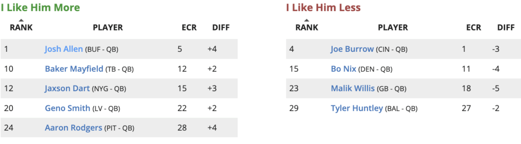Below, find out who The Wolf ranks higher, lower, and on ECR par with for his 2025 Week 17 Fantasy Football Rankings and Tiers, as well as his Hail Mary streamers. He’ll rip through at least 4-5 drafts of his rankings, updating them well-ahead of Christmas, Thursday Night Football & Saturday + Sunday Morning action.