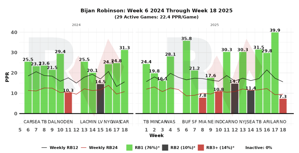 Yse, Arthur Smith‘s mind-boggling usage led to a “disappointing” RB8 finish during Robinson’s rookie year. Since Smith’s departure, Robinson has finished as the PPR RB3 (2024) & RB2 (2025) while totaling 342 & 377 FPs respectively.