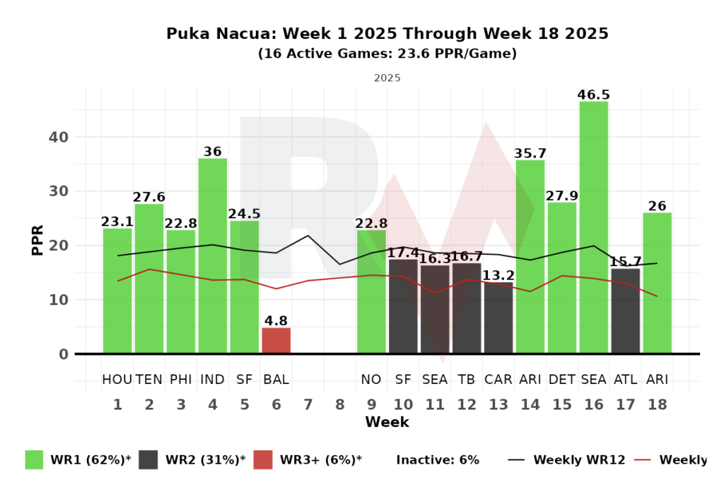 Last season, Nacua finished inside the Top-12 in 62% of games. He was a Top-24 WR and hit 13+ PPR FPs in all but one game, which he left due to injury. Per RotoViz: