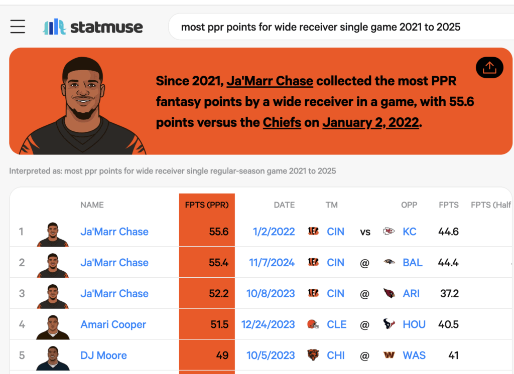 Since entering the league in 2021, Chase has recorded a whopping five of the Top-20 highest single-game WR scores. This includes all of the Top-3!