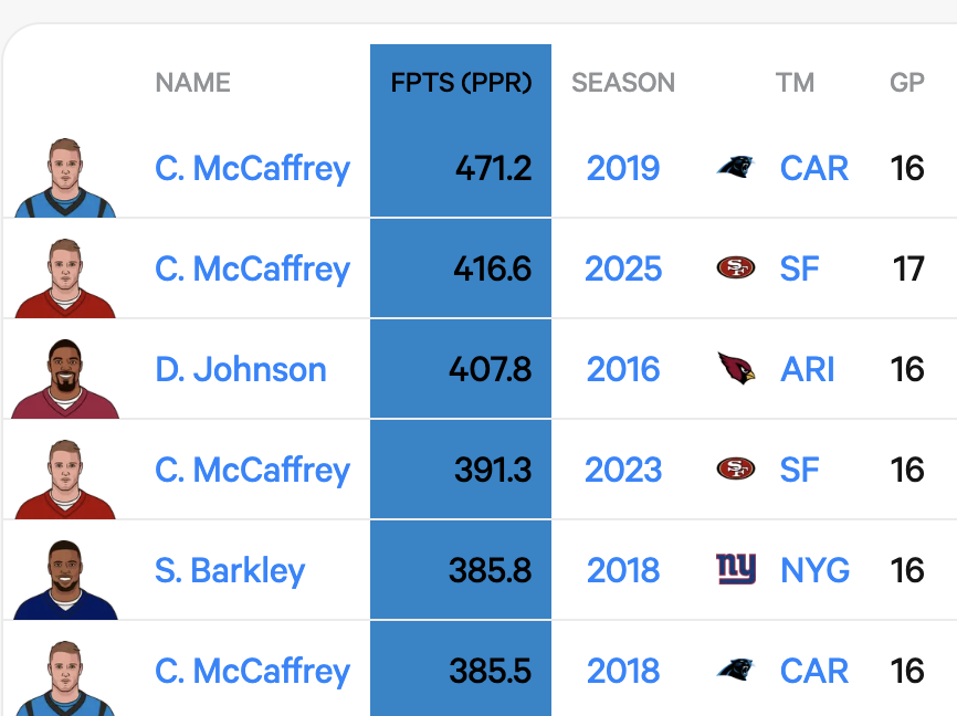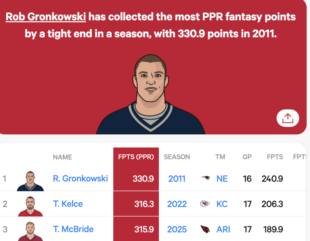 McBride scored 315 PPR FPs, the third-most all time, trailing only Rob Gronkowski (330.9 in 2011) and Travis Kelce (316.3 in 2022).