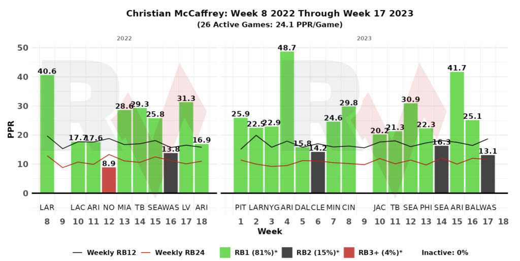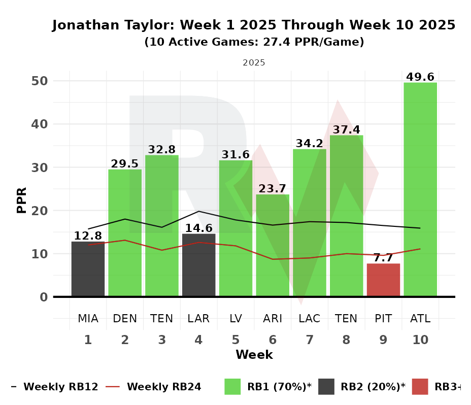 Achane’s incredible receiving usage and explosivity has led to remarkable consistency. Last season, Achane was Top-12 in 69% of his games and never dipped below the RB17 or 12.8 PPR FPs in Weekly Output.