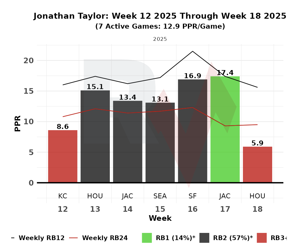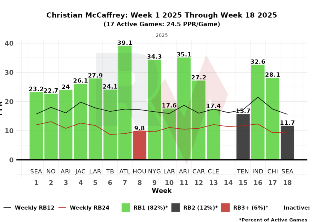 On the positive front, at least Slowik’s hire brings some continuity, even if it’s likely a steep decline from McDaniel. Additionally, Joe Mixon was the RB9 in FPPG (17.2) under Slowik in 2024 and averaged 21.2 opportunities per game. Through the first 13 games, Mixon was actually 2nd in FPPG (19.9) behind only Saquon Barkley.