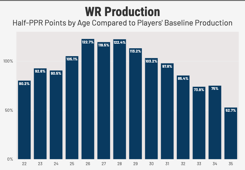 In 4for4’s Production Curves study, they noted Age 26-28 are the peak performance for WRs. Lamb will turn 27 in April: