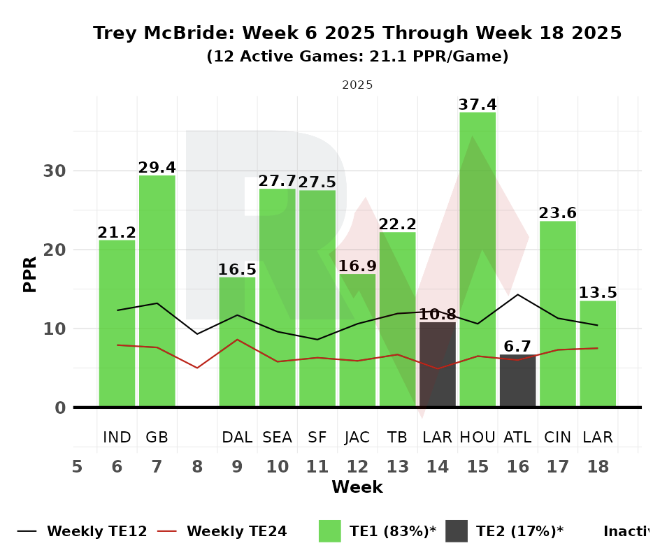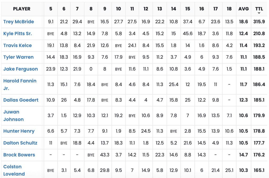 Through Weeks 1-5, McBride was hardly lighting the world on fire. He was the TE4 in total points, trailing Jake Ferguson, Dalton Kincaid, and Tyler Warren. His highest weekly output was 15.3 FPs, and he scored just 1 TD.