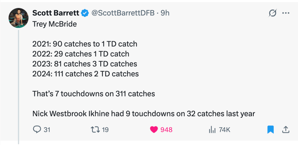 The 11 touchdowns were the most pleasant surprise of McBride’s season. Prior to 2025, McBride had scored just 6 total TDs through three seasons, never hitting more than 3 in a season. This seemed to be a real problem, as he scored 1, 4, 4, and 1 TDs across his four collegiate seasons too, and reportedly only scored 1 TD his senior year of high school: