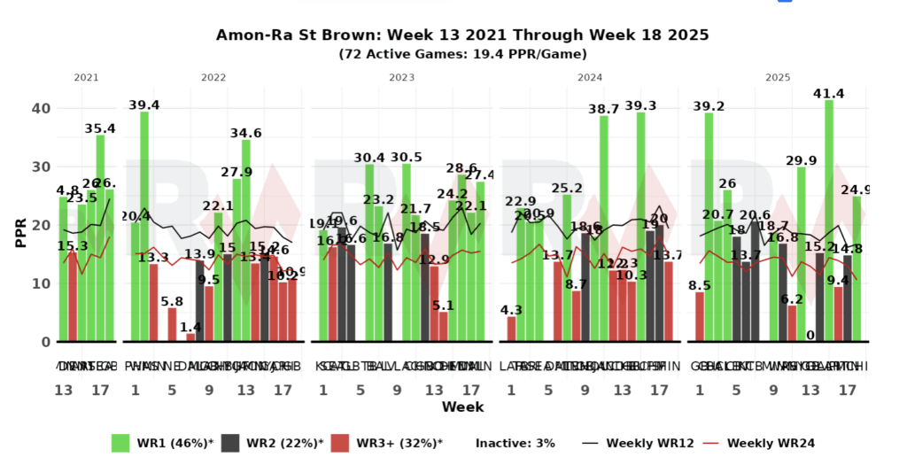 Nacua has ridden this volume and efficiency to WR6, WR3, and WR1 finishes in FPPG the past 3 seasons. He’s been incredibly consistent on a week-to-week basis, too. Nacua has finished as a Top-12 WR in 52% of his career games. He has only finished outside the Top-24 WRs in 3 total games, and two of those were for injuries.