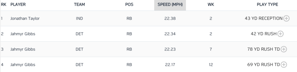 Robinson nearly doubled his explosive yards (472), 20+ yard runs (8), and recorded two 50+ yard runs, trailing only Jonathan Taylor (3) and TreVeyon Henderson (4). Robinson’s 93 yard rushing TD was the longest recorded by a RB all season.
