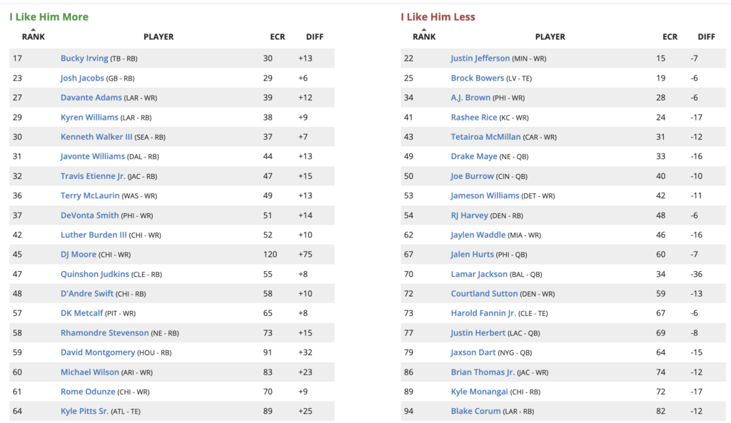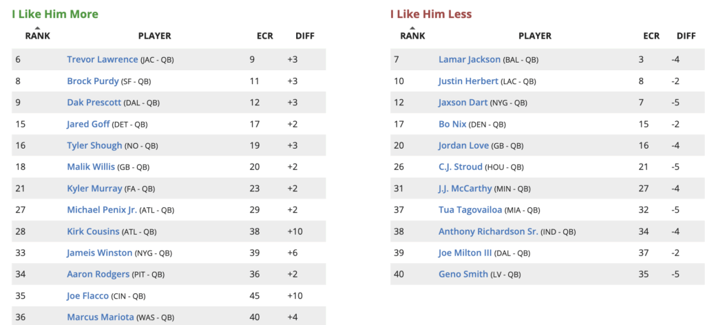 Here are the players I am higher or lower on in my fifth draft of 2026 Fantasy Football Rankings – Updated Wednesday, 3/5/26