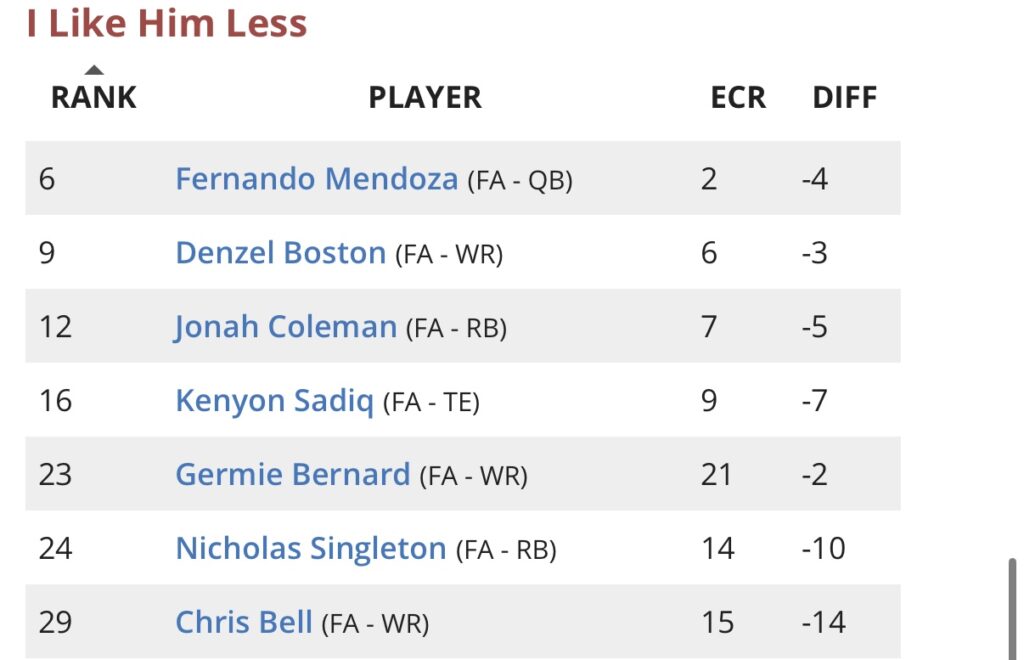 This year’s offensive rookies are overall underwhelming in comparison to recent years, but there will be prospects with glaring value simply because there is not a locked-in consensus ranking at each position outside of Love, Mendoza, and Sadiq (even though I have Stowers TE1). I certainly favor the wide receivers and tight ends as opposed to the quarterbacks and running backs in this class. I project 13 of the 20 wide receivers I have ranked to be selected within the first three rounds of the NFL Draft, while I only expect about four to five running backs to be selected before the end of Round 3.