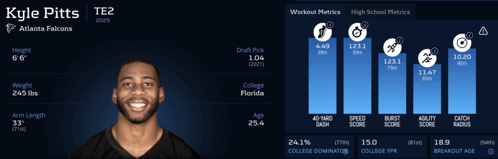 Pitts ran the second-fastest forty time by a TE all-time (4.40), trailing only Vernon Davis. His weight-adjusted speed score of 130.7 also ranks 2nd-best. Unsurprisingly, Pitts ranked 99th percentile in all speed-based metrics, as well as 94th percentile in Breakout Age (18.9), per PlayerProfiler.