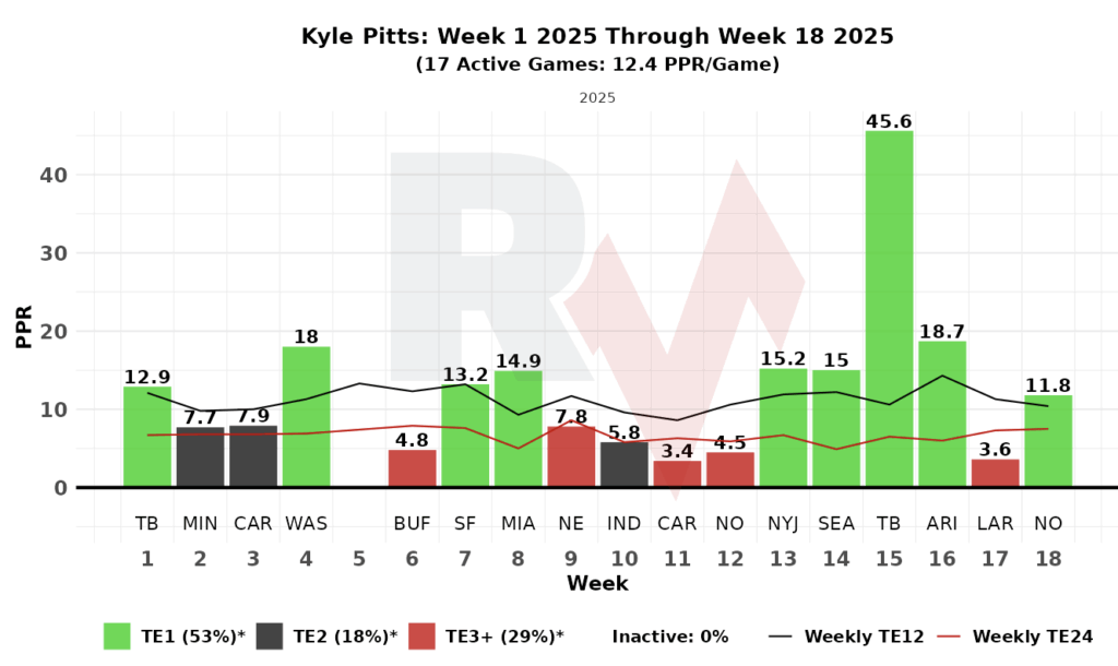 Pitts’ 2025 Pace without London: 150 targets, 119 catches, 1435 yards, 10 TDs, 324 FPs (19.04). This would’ve actually bested Trey McBride‘s historic 2025 season (18.6 FPPG) and ranked as the TE1.
