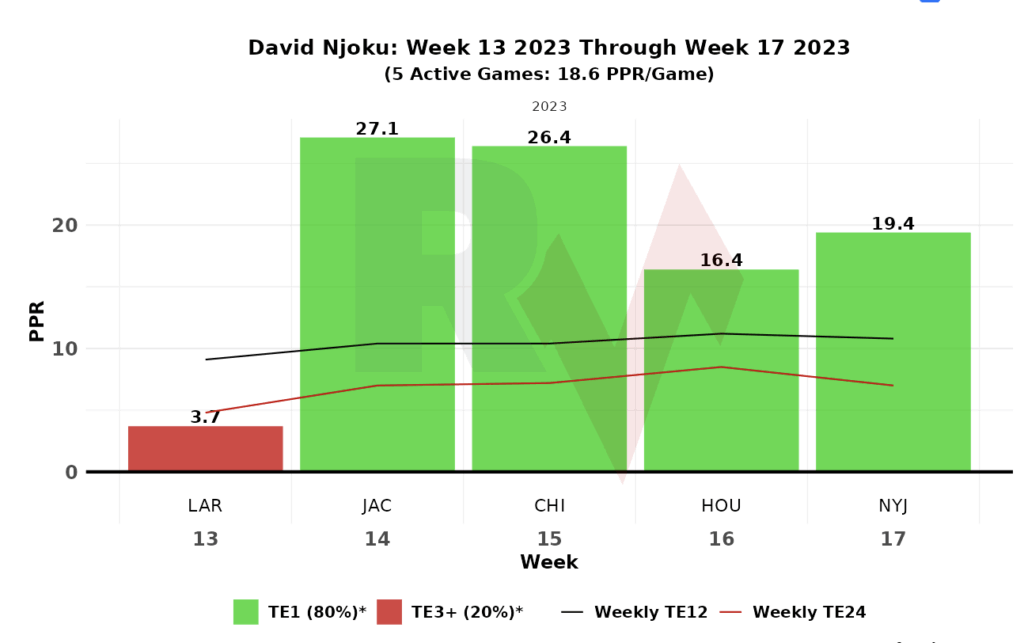Even more impressive, with Flacco under center in 2023, Njoku was the TE2 in FPG (18.2), finishing with 16+ PPR FPs in 4-of-5 games