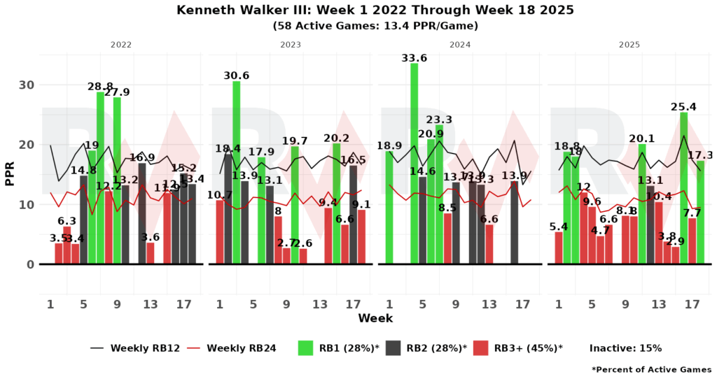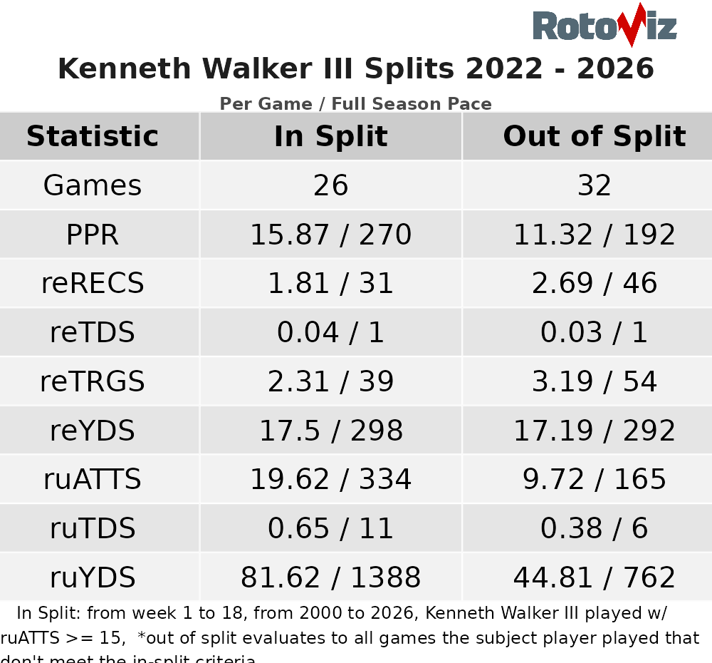 In the 26 games Walker is given at least 15 carries per game, he averages a healthy 15.9 PPR points per game on the back of more than 1,500 yards from scrimmage and 12 TDs.