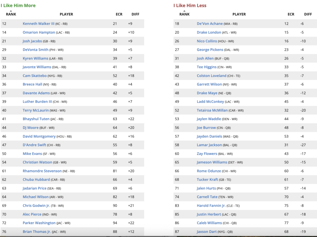 Here are the players I am higher or lower on in my seventh draft of 2026 Fantasy Football Rankings – Updated Sunday, 4/26/26