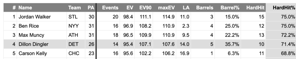 Also, to date, Muncy ranks 3rd across the league in hard hit percentage and 5th in average exit velocity (shown above).