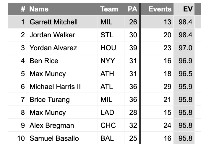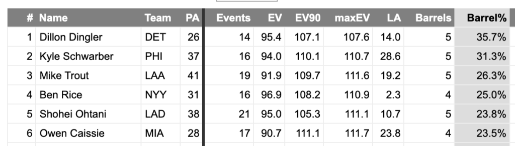 My highlighted preseason waiver wire catcher add, Samuel Basallo, has started in 6 of 8 of the Orioles’ games, and has batted in the heart of the order each time (4th once and 5th 5 times). While off to a slow start, Basallo’s first home run of the season showed his raw power and run-generating abilities, which is backed by his 10th-ranked average exit velocity (shown).