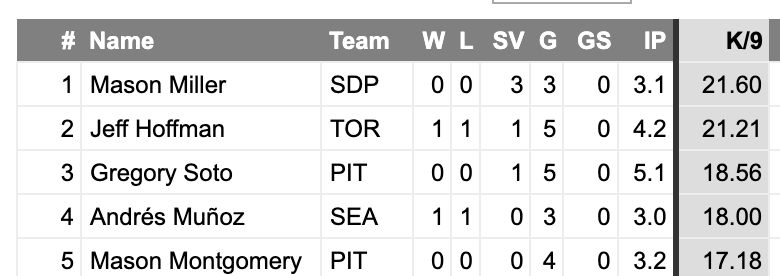 Pirates Manager Don Kelly indicated early that Dennis Santana would potentially not be the full-time closer, and that looks to be the case so far in 2026. Gregory Soto has come out guns blazing, recording a whopping 11 strikeouts over 5.1 innings pitched, posting the third-best reliever K9 so far (yes, it is quite early, but still impressive!).