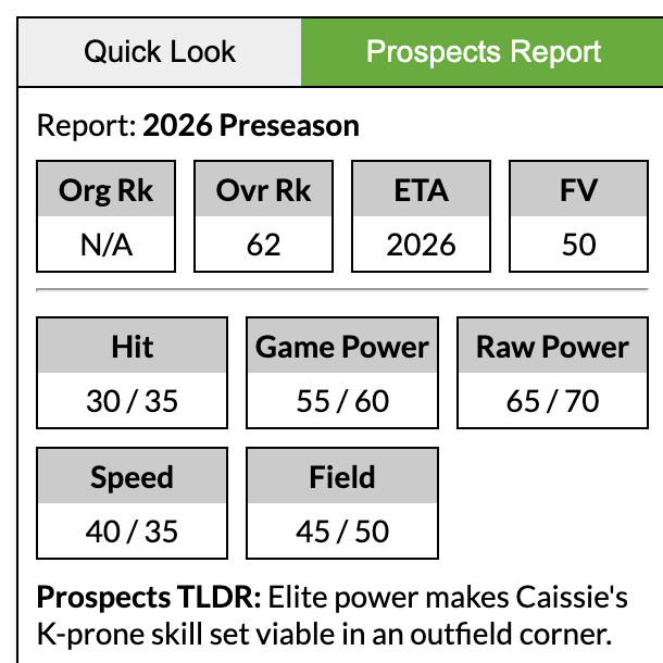 Caissie is off to a furious start to the 2026 season, slashing .320/.997, with 2 homers, 9 RBI, 4 runs, and 1 SB. And he is tearing the cover off the ball, ranking 6th in barrel percentage so far in the early season.