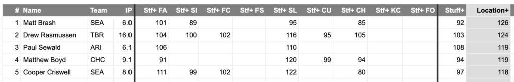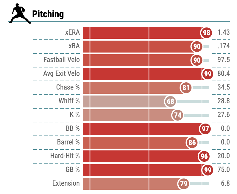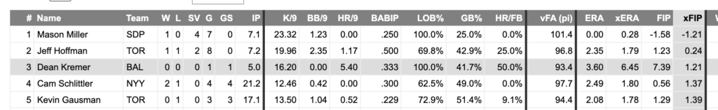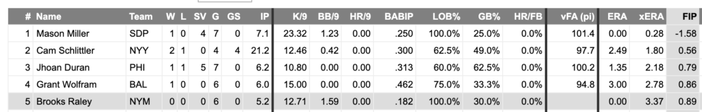 Honestly, Mason Miller deserves to be in a category of his own. Through 7 appearances, Miller boasts an other-worldly 23.32 K/9, striking out 19 batters in just 7.1 IP, walking just one. And while a 0.00 ERA is as good as it gets, a (league-leading) negative 1.58 FIP and (league-leading) negative 1.21 xFIP are even more impressive.