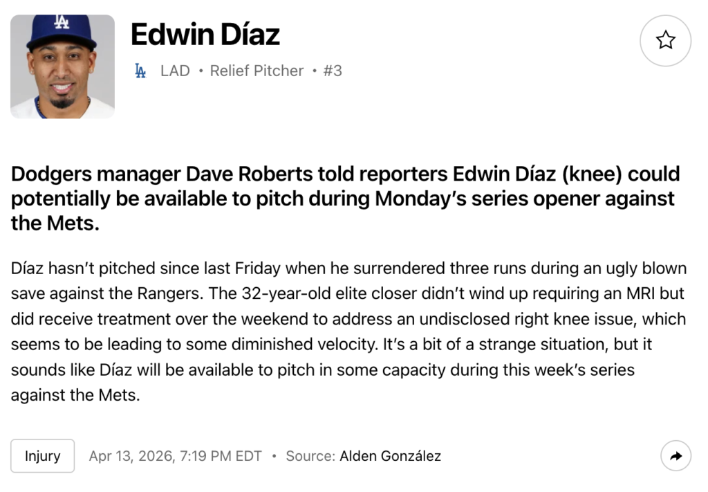Dodgers’ Manager Dave Roberts reported on Monday that Diaz would potentially be able to pitch the series opener, so Diaz looks to be in the clear for now, but this will definitely be a situation to monitor moving forward.